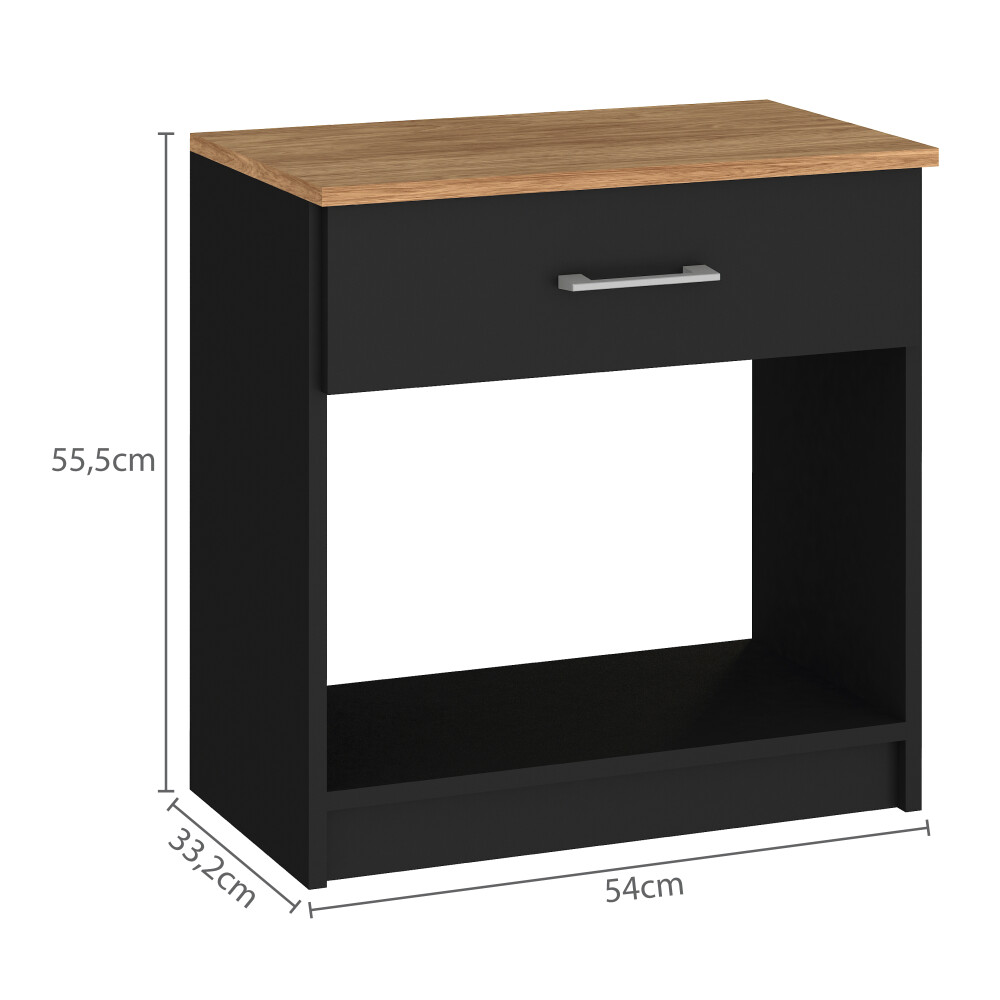 Mesa de Luz Italia: diseño escandinavo en MDP con tapa miel. Incluye un cajón con tirador de ABS y nicho organizador. Medidas: 54x55,5x33,2 cm. Disponible en Blanco/Miel y Negro/Miel. Funcionalidad y estilo para tu dormitorio. ¡Renueva tu espacio!