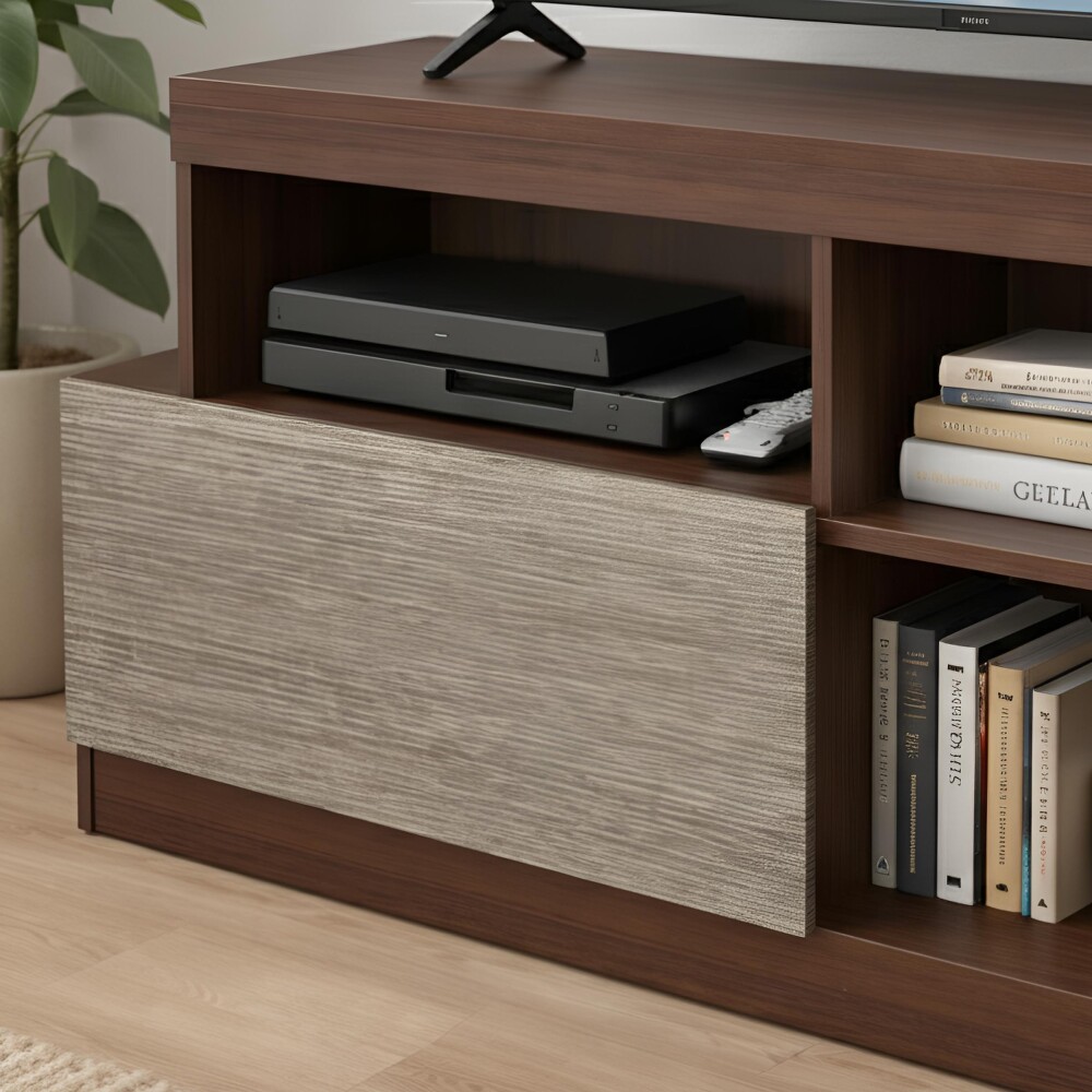 Este rack para TV combina funcionalidad y diseño contemporáneo, ideal para quienes buscan un mueble práctico y elegante. Su terminación en Wood Marrón Mate aporta calidez, mientras que la puerta abatible Wood Tenerife texturizada brillante suma un detalle distintivo y sofisticado.