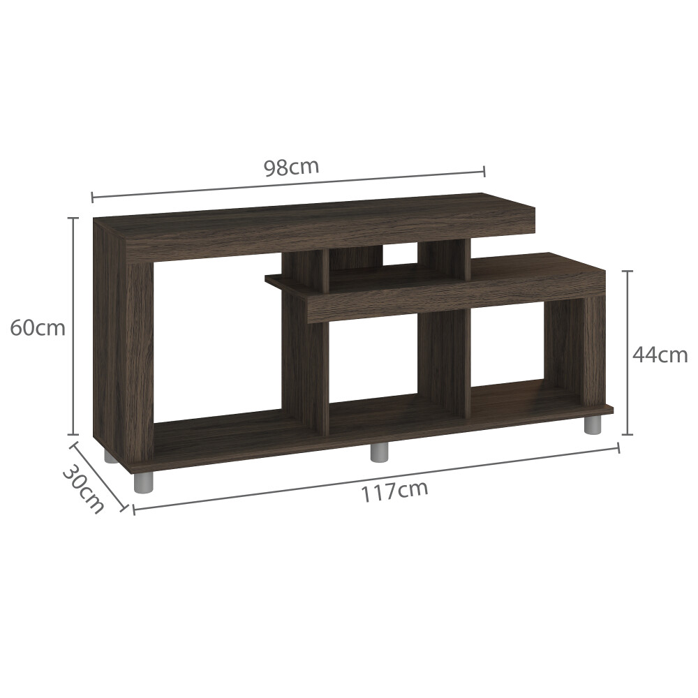 Rack TV hasta 42" estilo escandinavo. Estructura de MDP 15mm, nichos para electrónicos con pasacables y patas de polipropileno. Medidas: 117x60x30 cm. Espacio de 90cm para pantalla. Diseño moderno y funcional en tonos Rústico o Cinamomo